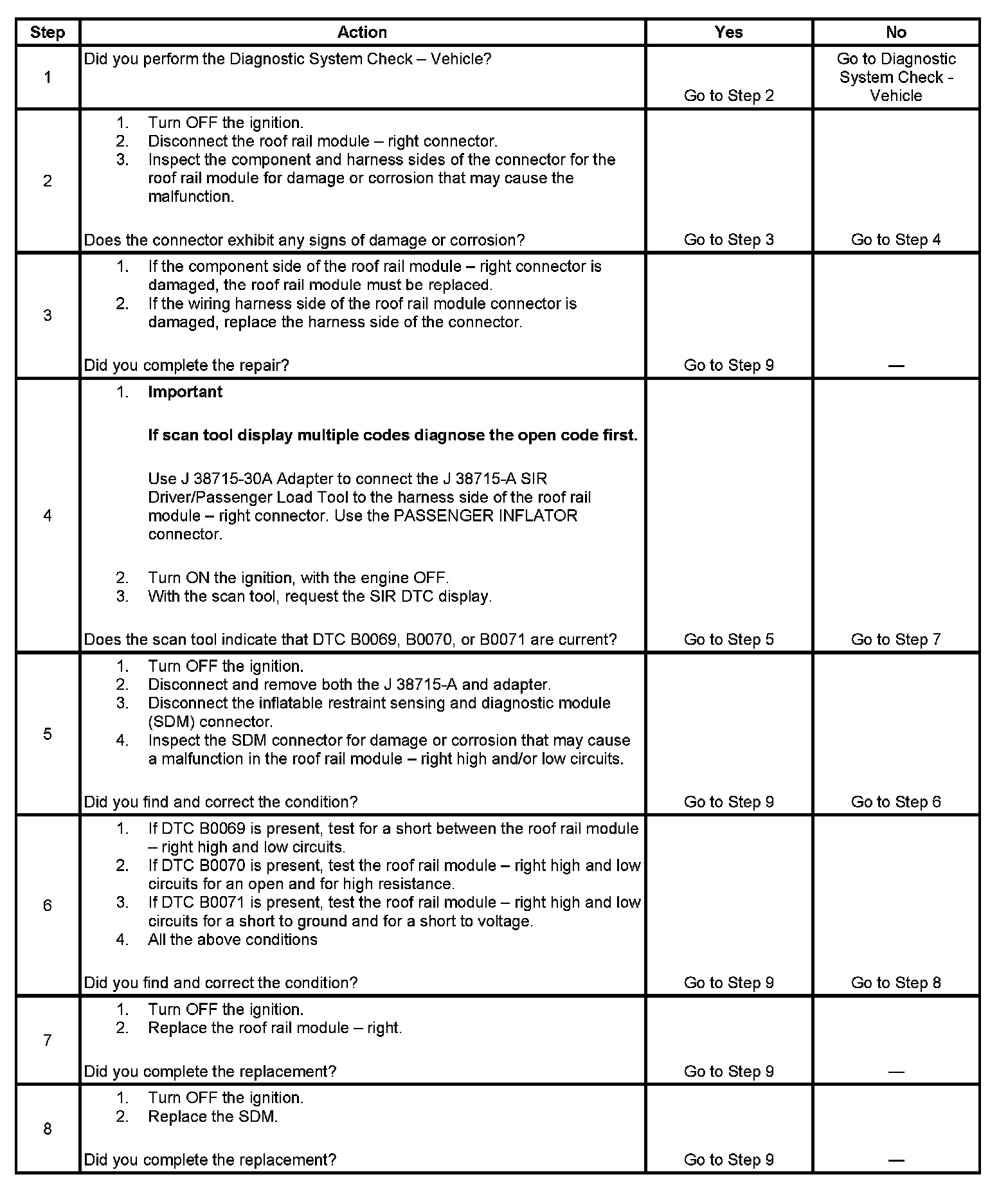 6. This step tests to see what DTCs are present. If DTC B0069 is present, test for a short between the roof rail module - right high and low circuits. If DTC B0070 is present, test the roof rail module - right high and low circuits for an open and for high resistance. If DTC B0071 is present, test the roof rail module - right high and low circuits for a short to ground and for a short to voltage.