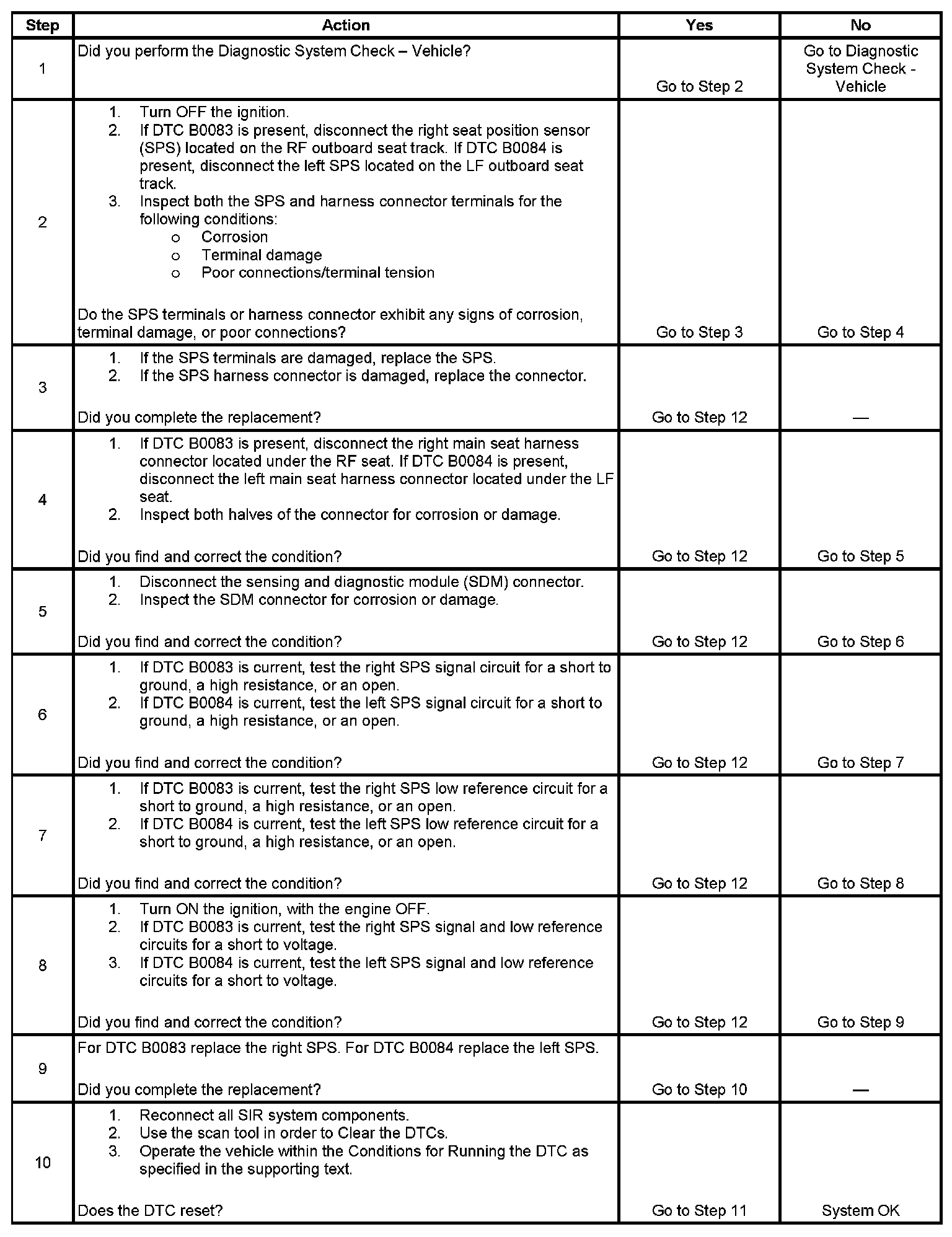 The inflatable restraint seat position sensor (SPS) is used to determine the proximity of a front driver or passenger seat position with respect to the frontal air bag. The SPS interfaces with the sensing and diagnostic module (SDM). The state of the SPS allows the SDM to disable stage 2 of the frontal air bag for a front seat that is forward of a forward/rearward point in seat track travel. The SPS is a hall effect sensor that is mounted on the outboard seat track of both the driver and passenger seats. The seat track includes a metal bracket that shunts the SPS magnetic circuit creating 2 states of seat position. The shunted state represents a rearward seat position. The non-shunted state represents a forward position. The SPS provides 2 current ranges, one range for the shunted state and a second range for a non-shunted state. These 2 states are inputs to the SDM. State 1 (shunted) being the rearward threshold and state 2 (non-shunted) being the forward threshold. When the SDM receives input from a SPS that state 1 threshold is reached (seat is rearward) the SDM will not disable stage 2 deployment, if required by the deployment sensors. When state 2 threshold is reached (seat is forward) the SDM will disable stage 2 deployment on the side the seat is forward. The SDM monitors the SPS circuit and if a fault is detected the SDM will set codes B0083 or B0084 and defaults to disabling stage 2 frontal deployment. This will only default on the side of the vehicle the sensor has a fault. Its important to understand that the SPS is secondary to the passenger presence system (PPS) and the manual instrument panel (I/P) module disable switch. If either one of these devices are in the disable mode the passenger air bag will not deploy regardless of the SPS status.