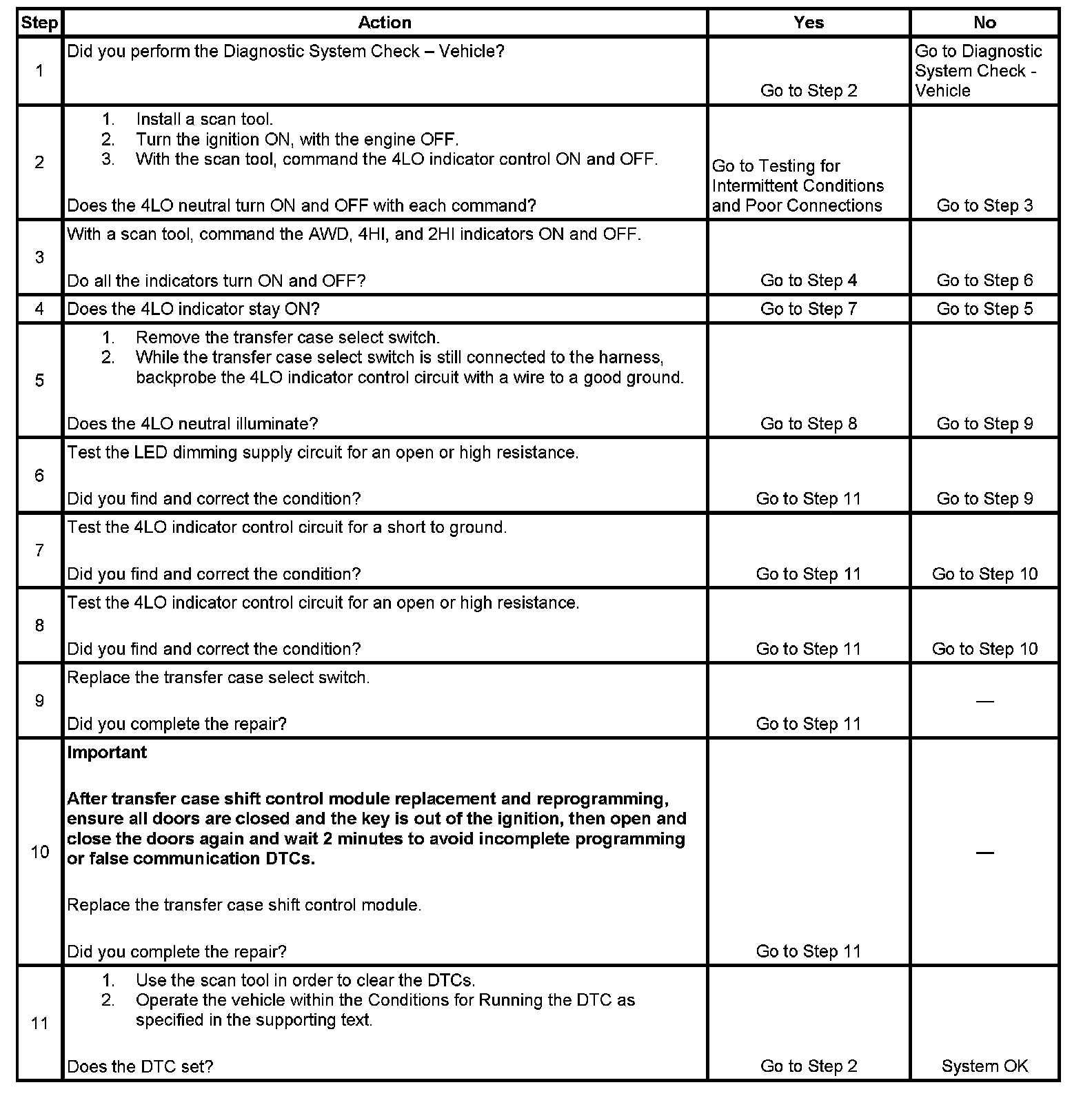 ^ If the system detects a voltage of 3 volts or less for 1.5 seconds when the 4LO indicator is not commanded, the DTC is logged.