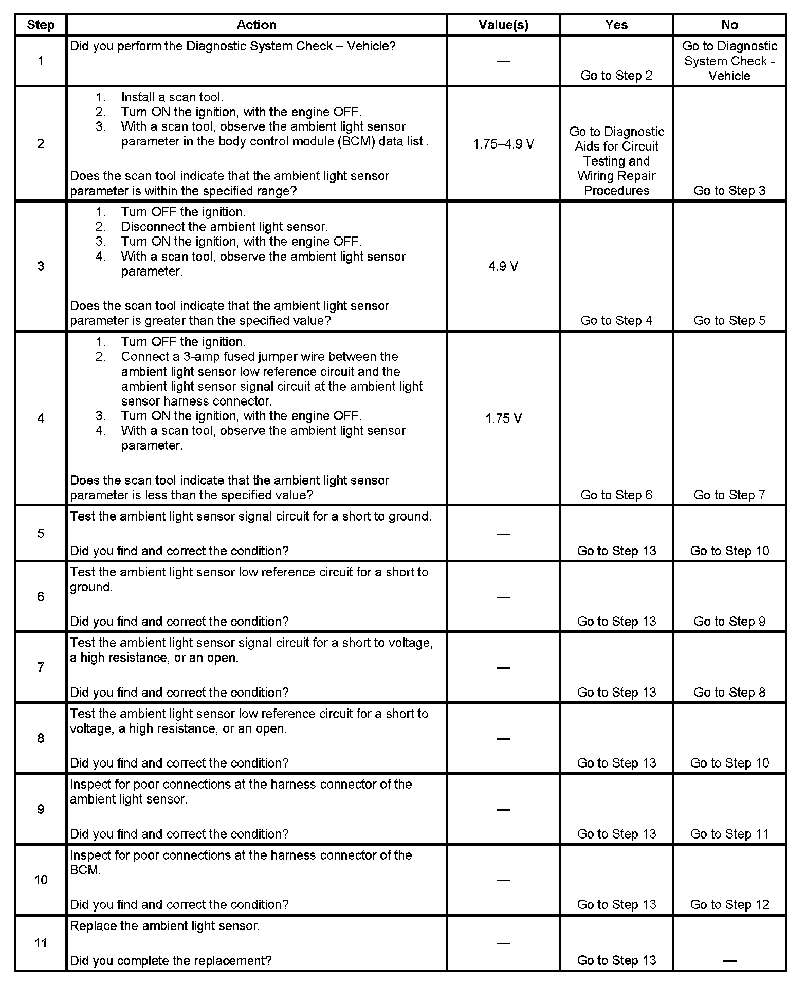 The body control module (BCM) monitors the ambient light sensor signal circuit in order to determine if the daytime running lights (DRL) or the auto headlights (ALC) should be turned ON in the AUTO mode. When the BCM senses the ambient light sensor signal voltage is between 1.75-4.9 volts, either the DRL will be commanded ON or the ALC will be commanded ON depending upon the amount of light received by the sensor.