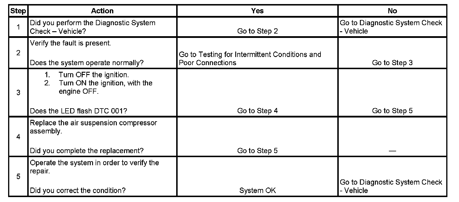 The air suspension compressor assembly will set a DTC 001 when any of these conditions are present:
