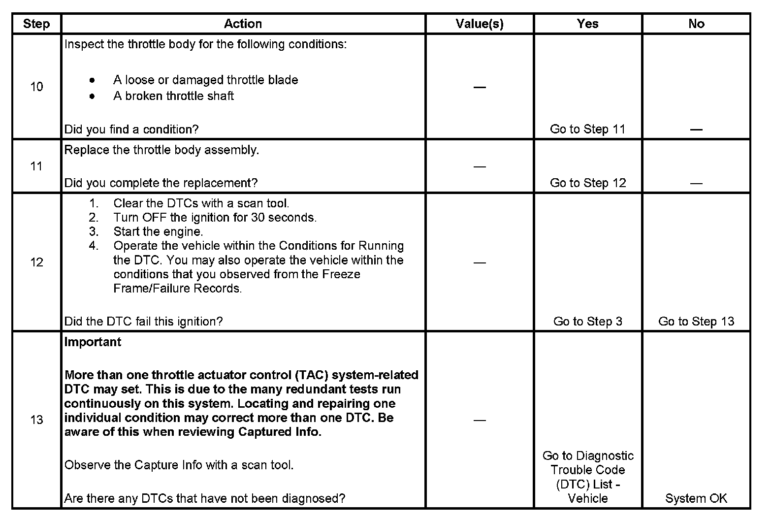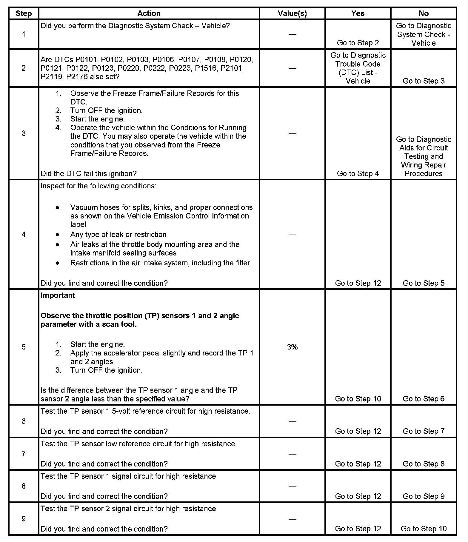 - DTCs P0101, P0102, P0103, P0106, P0107, P0108, P0120, P0121, P0122, P0123, P0220, P0221, P0222, P0223, P0601, P0602, P0603, P0604, P0606, P0607, P1516, P2101 are not set.