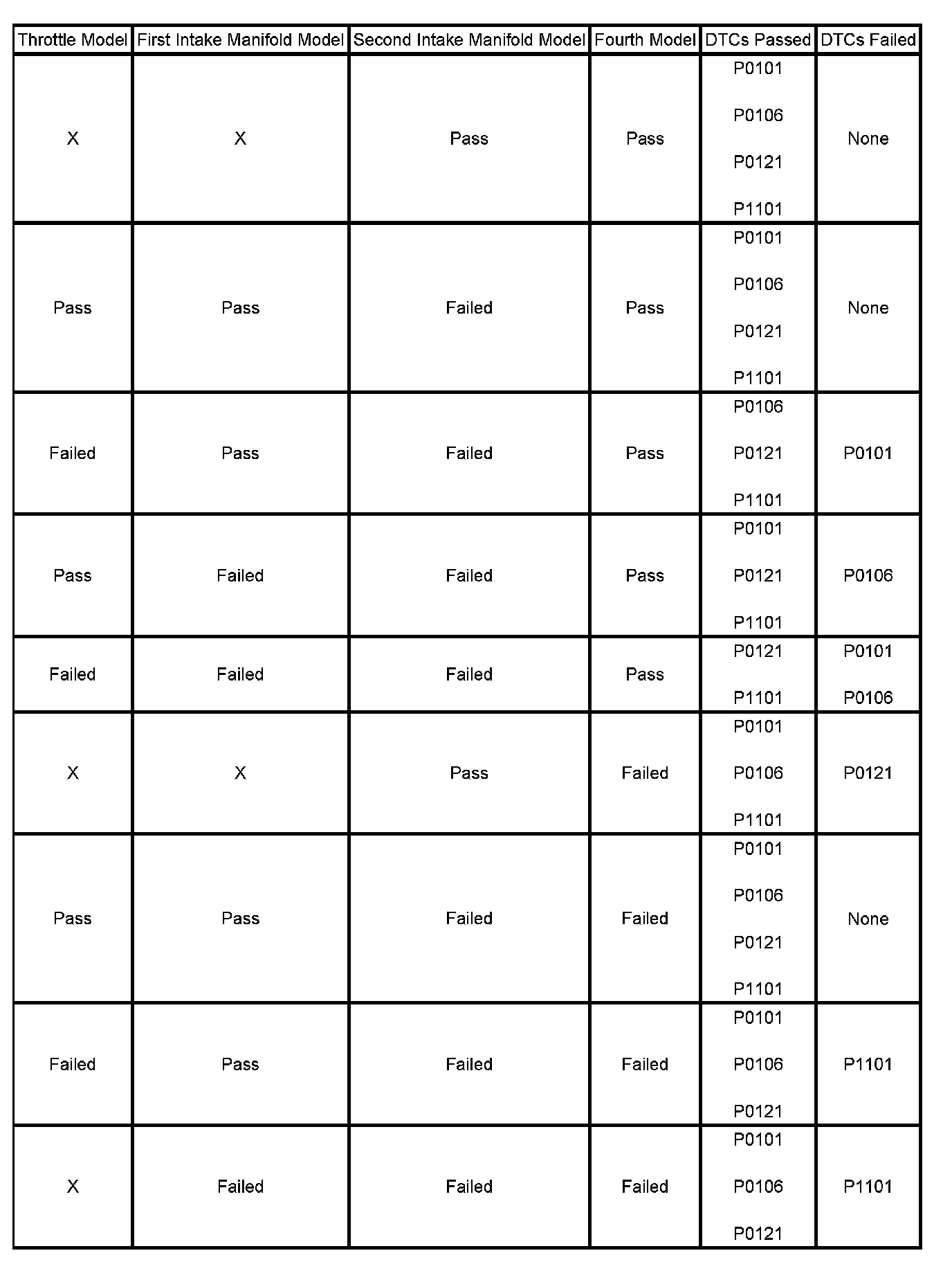 The estimates of MAF and MAP obtained from this system of models and calculations are then compared to the actual measured values from the MAF, MAP, and the TP sensors and to each other to determine the appropriate DTC to fail. The table illustrates the possible failure combinations and the resulting DTC or DTCs.