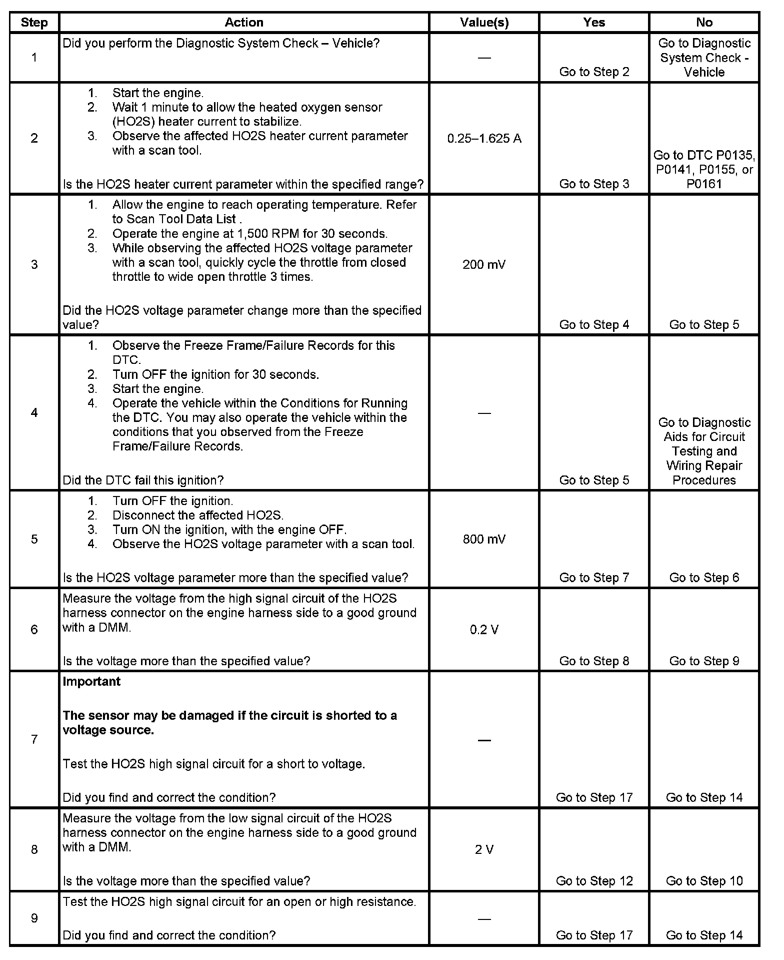 Heated oxygen sensors (HO2S) are used for fuel control and post catalyst monitoring. Each HO2S compares the oxygen content of the surrounding air with the oxygen content in the exhaust stream. The HO2S must reach operating temperature to provide an accurate voltage signal. Heating elements inside the HO2S minimize the time required for the sensors to reach operating temperature. The engine control module (ECM) supplies the HO2S with a reference, or bias, voltage of about 450 mV. When the engine is first started, the ECM operates in Open Loop, ignoring the HO2S voltage signal. Once the HO2S reaches operating temperature and Closed Loop is achieved, the HO2S generates a voltage within a range of 0-1,000 mV that fluctuates above and below bias voltage. High HO2S voltage indicates a rich exhaust stream. Low HO2S voltage indicates a lean exhaust stream. This diagnostic will only run once per ignition cycle. If the ECM detects that the HO2S voltage remains within the bias voltage range, DTC P0140 sets for HO2S bank 1 sensor 2, or DTC P0160 sets for HO2S bank 2 sensor 2.