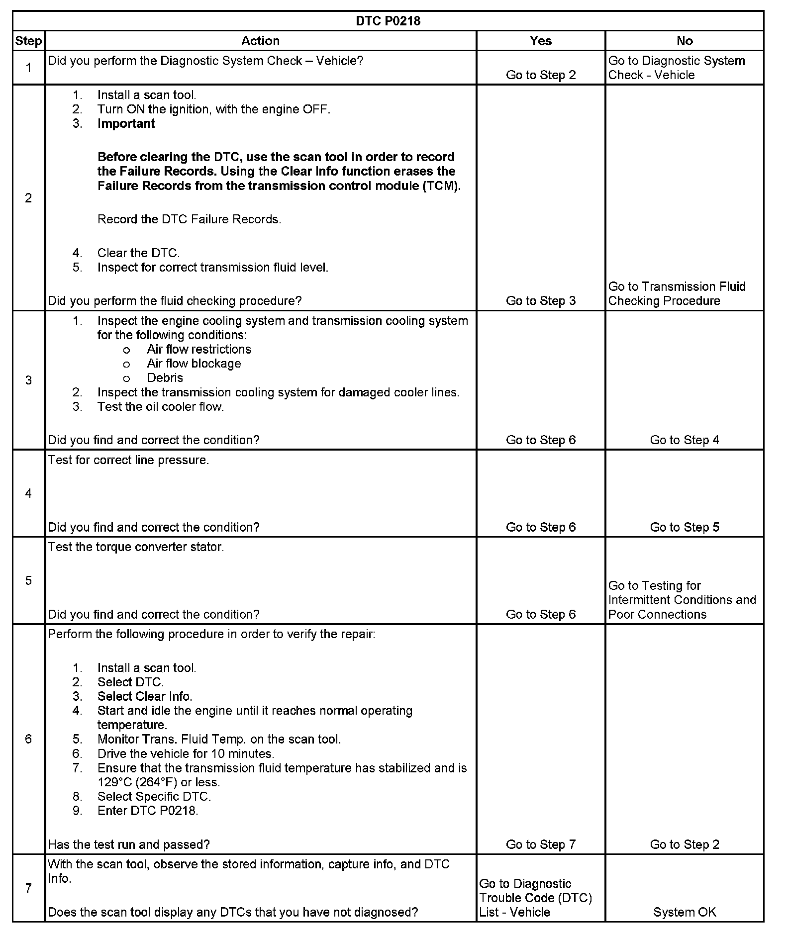 When the transmission control module (TCM) detects a high transmission fluid temperature (TFT) for a long period of time, then DTC P0218 sets. DTC P0218 is a type C DTC.