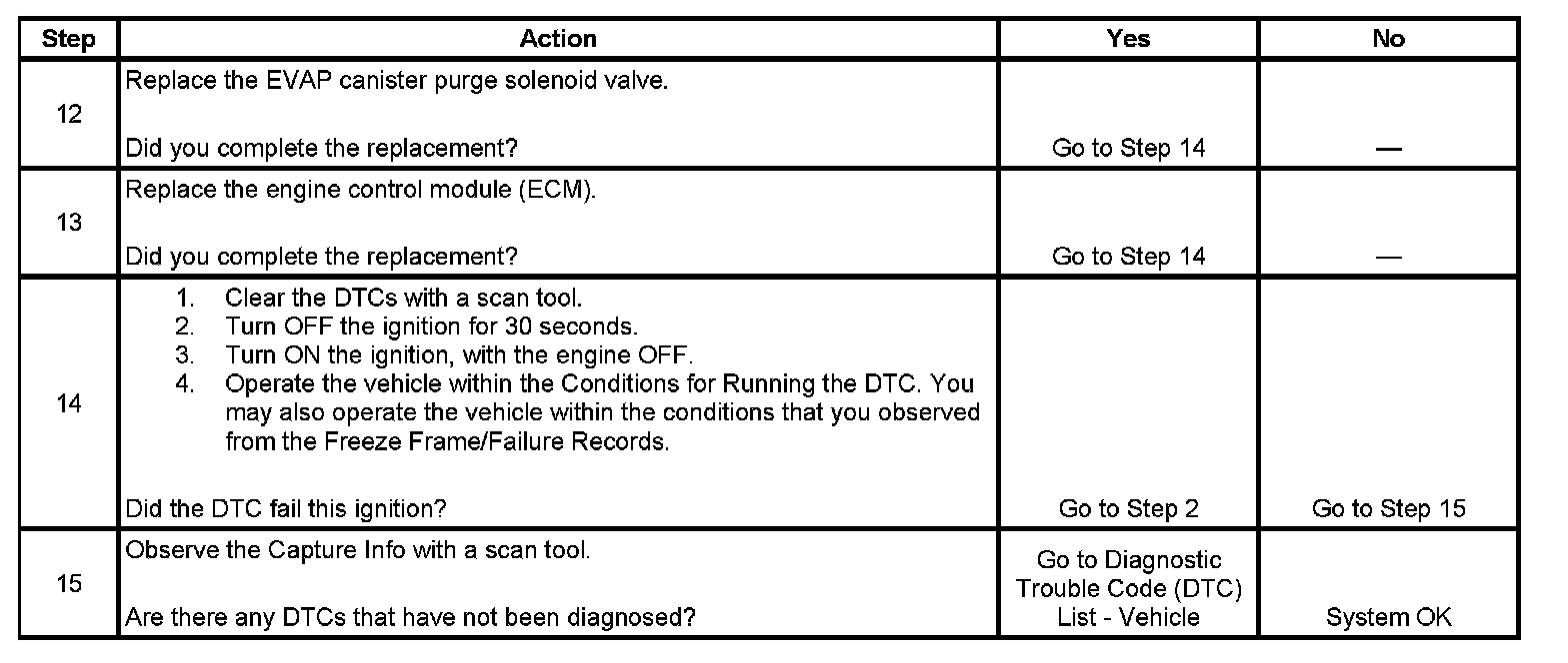 An ignition voltage is supplied directly to the evaporative emission (EVAP) canister purge solenoid valve. The EVAP canister purge solenoid valve is pulse width modulated (PWM). The scan tool displays the amount of ON time as a percentage. The control module monitors the status of the driver. The control module controls the EVAP canister purge solenoid valve ON time by grounding the control circuit via an internal switch called a driver. If the control module detects an incorrect voltage for the commanded state of the driver, this DTC sets.