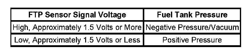 The table illustrates the relationship between the FTP sensor signal voltage and the EVAP system pressure/vacuum.
