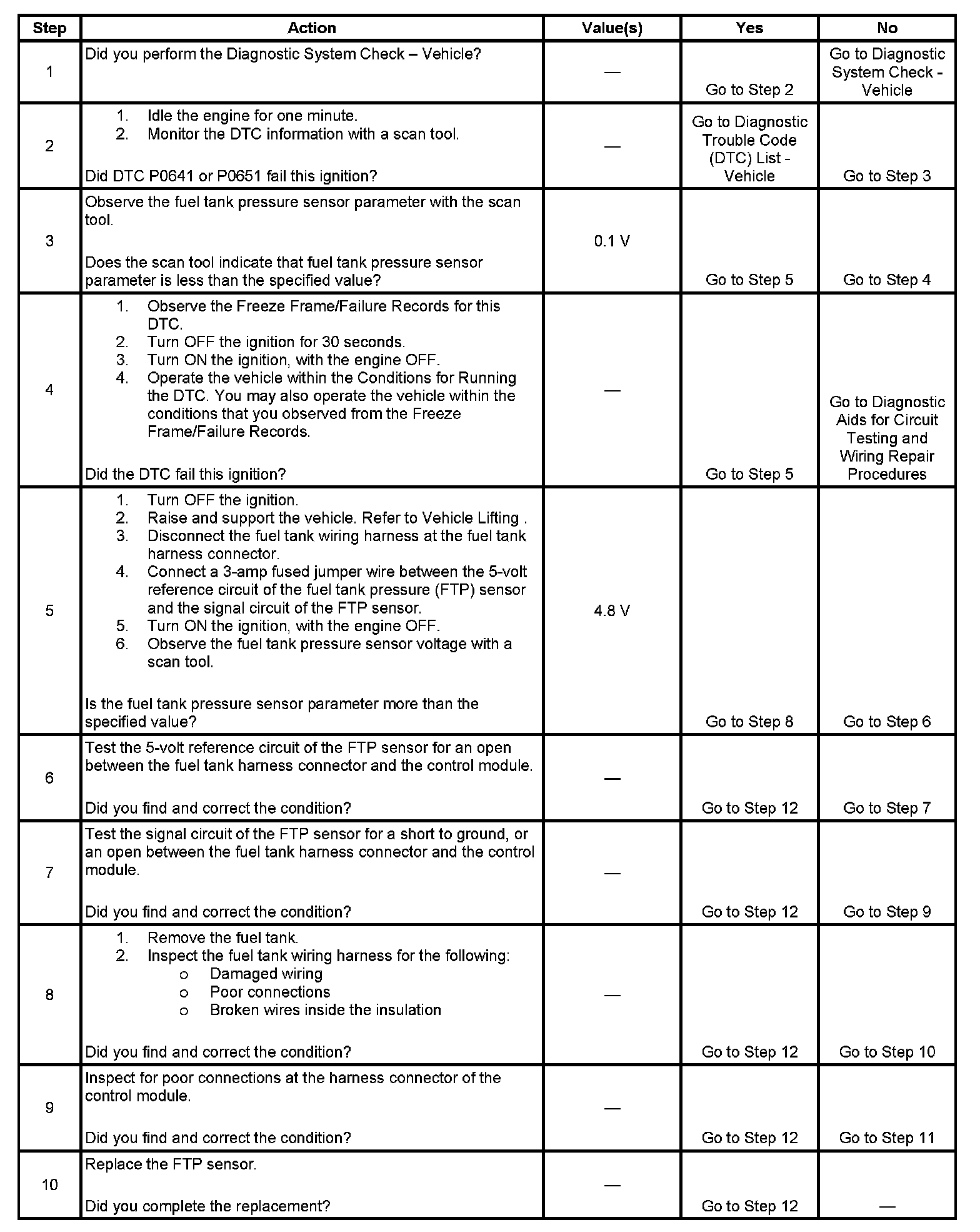 The fuel tank pressure (FTP) sensor measures the difference between the air pressure or vacuum in the evaporative emission (EVAP) system, and the outside air pressure. The control module supplies a 5-volt reference and a low reference circuit to the FTP sensor. The FTP sensor signal circuit voltage varies depending on EVAP system pressure or vacuum. If the FTP sensor signal voltage goes below a calibrated value, this DTC sets.