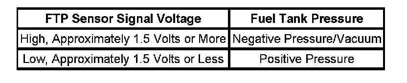 The table illustrates the relationship between FTP sensor signal voltage and the EVAP system pressure/vacuum.