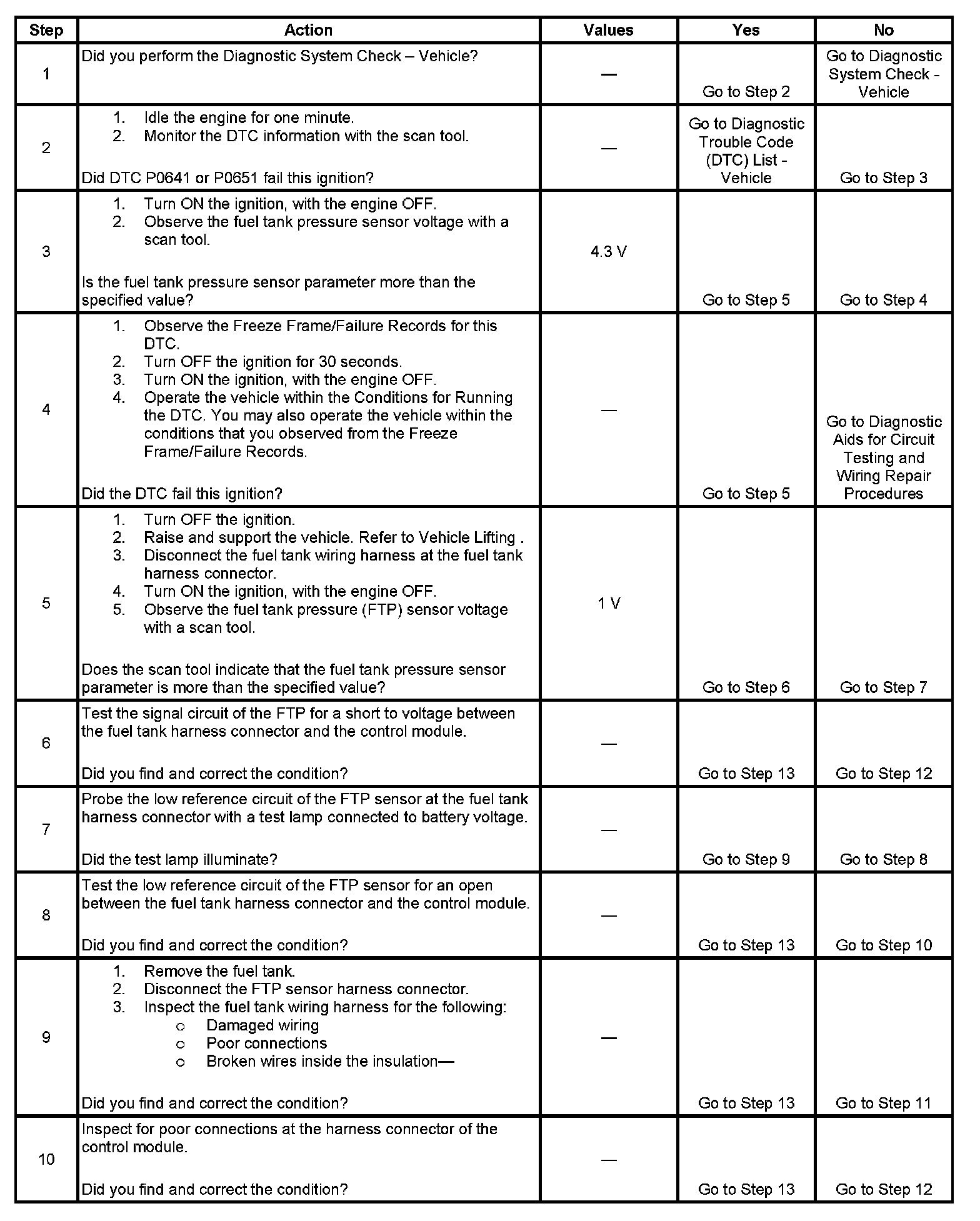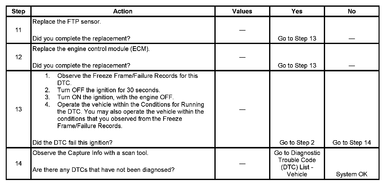 The fuel tank pressure (FTP) sensor measures the difference between the air pressure or vacuum in the evaporative emission (EVAP) system, and the outside air pressure. The control module supplies a 5-volt reference and a low reference circuit to the FTP sensor. The FTP sensor signal circuit voltage varies depending on EVAP system pressure or vacuum. If the FTP sensor signal voltage increases above a calibrated value, this DTC sets.