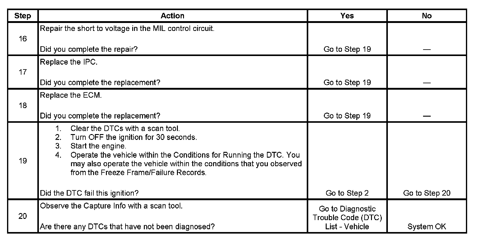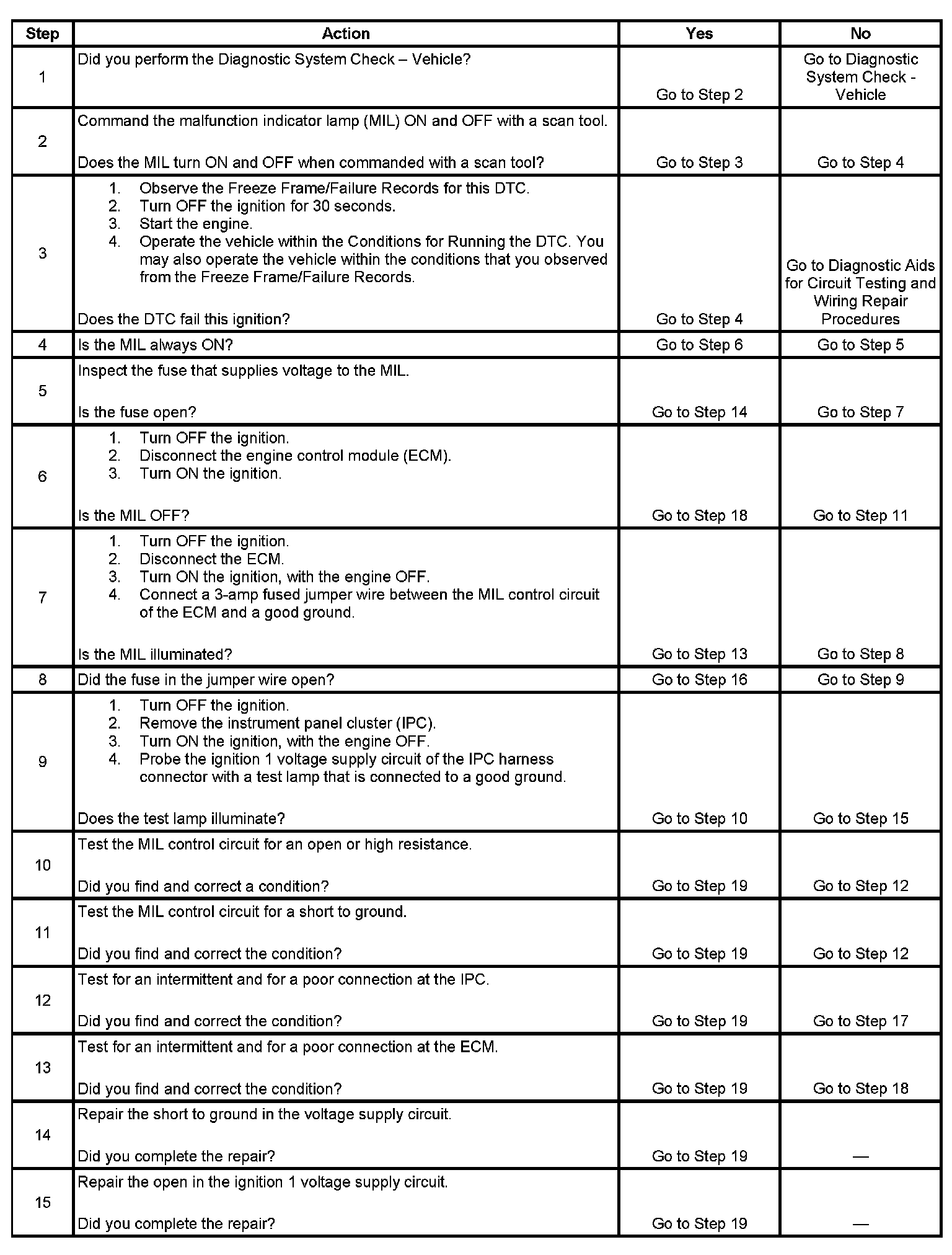 6. This step tests for a short to ground in the MIL control circuit. With the engine control module (ECM) disconnected and the ignition ON, the MIL should be OFF.