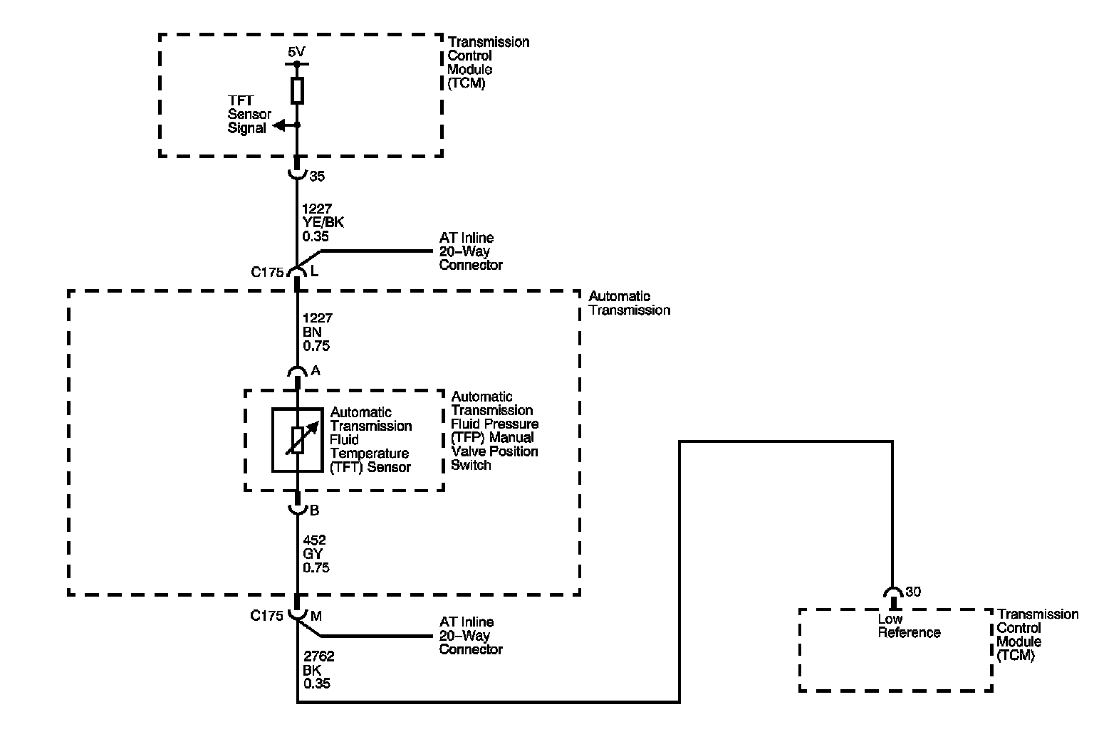 The automatic transmission fluid temperature (TFT) sensor is part of the automatic transmission fluid pressure (TFP) manual valve position switch. The TFT sensor is a thermistor, or a resistor that changes value when the temperature changes. The sensor has a negative-temperature coefficient. This means that as the temperature increases, the resistance decreases, and as the temperature decreases, the resistance increases. The transmission control module (TCM) supplies a 5-volt reference signal to the sensor and measures the voltage drop in the circuit. When the transmission fluid is cold, the sensor resistance is high and the TCM detects high signal voltage. As the fluid temperature increases, the resistance of the sensor decreases, which lowers the signal voltage.