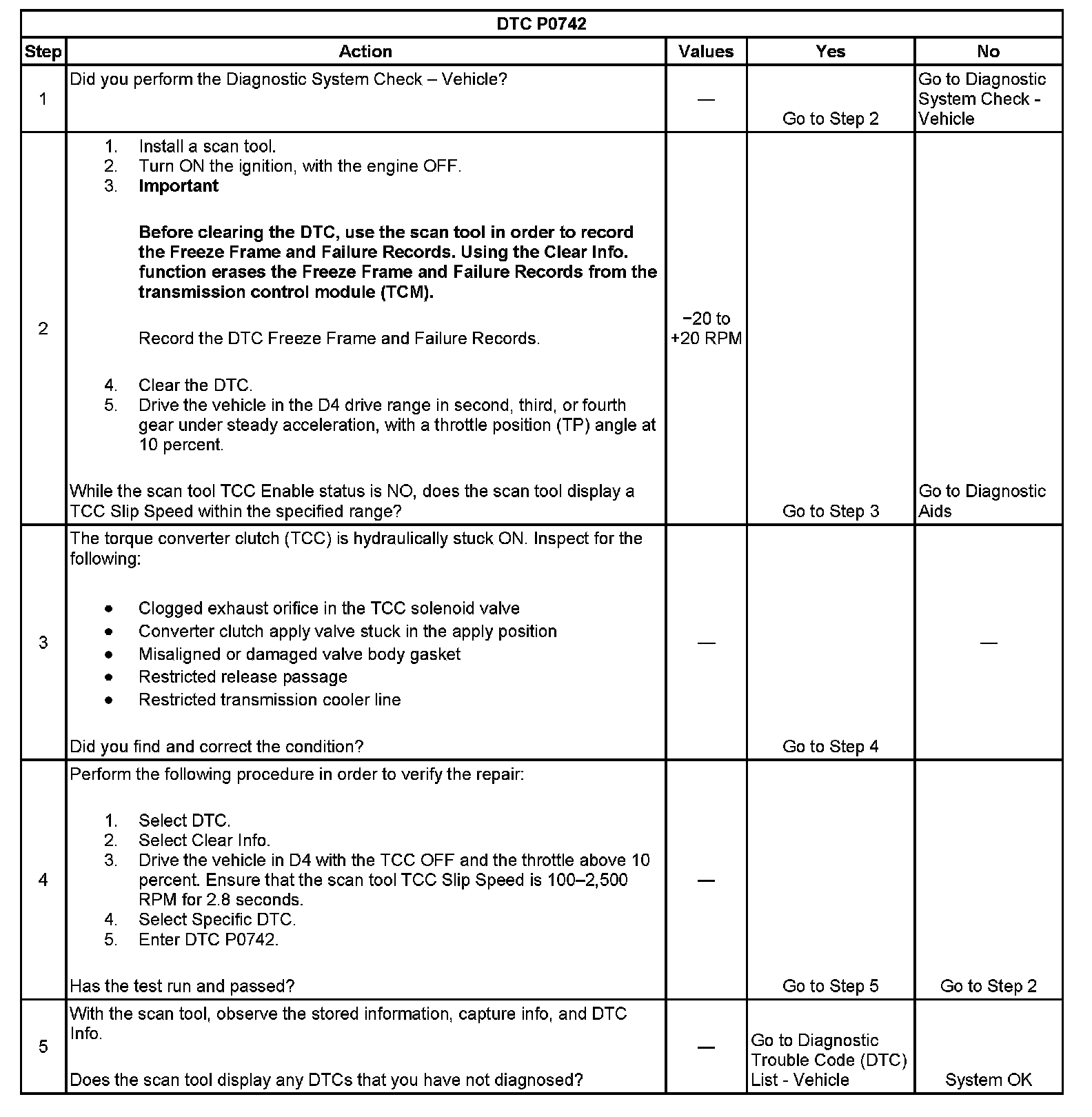 When the TCM detects low torque converter slip when the TCC is commanded OFF, then DTC P0742 sets. DTC P0742 is a type B DTC.