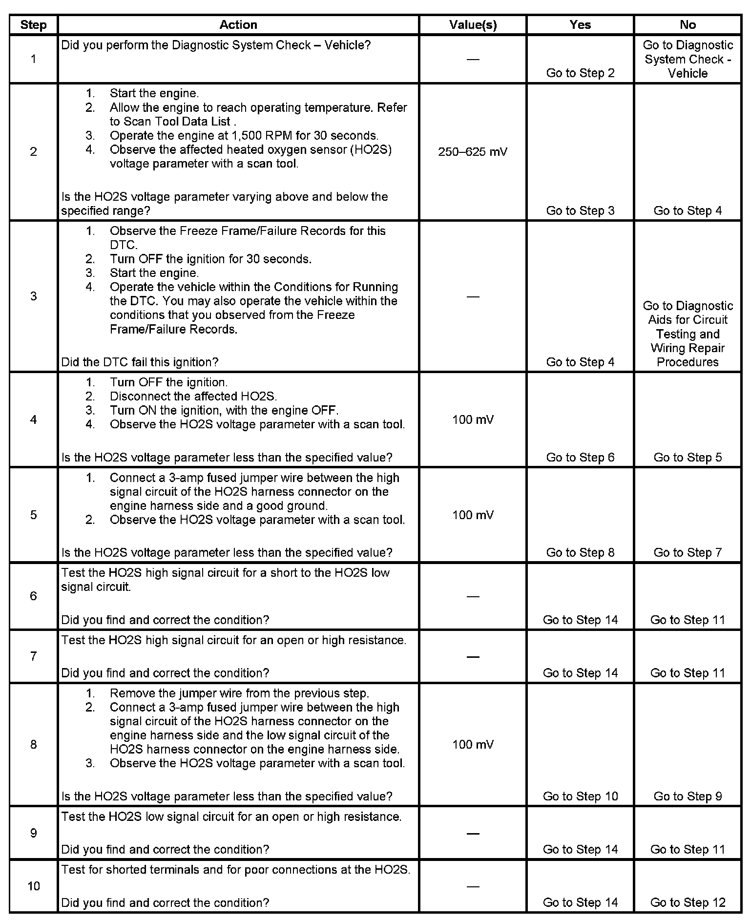 Heated oxygen sensors (HO2S) are used for fuel control and post catalyst monitoring. Each HO2S compares the oxygen content of the surrounding air with the oxygen content in the exhaust stream. The HO2S must reach operating temperature to provide an accurate voltage signal. Heating elements inside the HO2S minimize the time required for the sensors to reach operating temperature. The engine control module (ECM) supplies the HO2S with a reference, or bias, voltage of about 450 mV. When the engine is first started, the ECM operates in Open Loop, ignoring the HO2S voltage signal. Once the HO2S reaches operating temperature and Closed Loop is achieved, the HO2S generates a voltage within a range of 0-1,000 mV that fluctuates above and below bias voltage. High HO2S voltage indicates a rich exhaust stream. Low HO2S voltage indicates a lean exhaust stream. This diagnostic will only run once per ignition cycle. The ECM monitors the number of rich-to-lean and lean-to-rich transitions. If the ECM detects that the number of transitions were less than a specified value, DTC P1133 sets for HO2S bank 1 sensor 1, or DTC P1153 sets for HO2S bank 2 sensor 1.