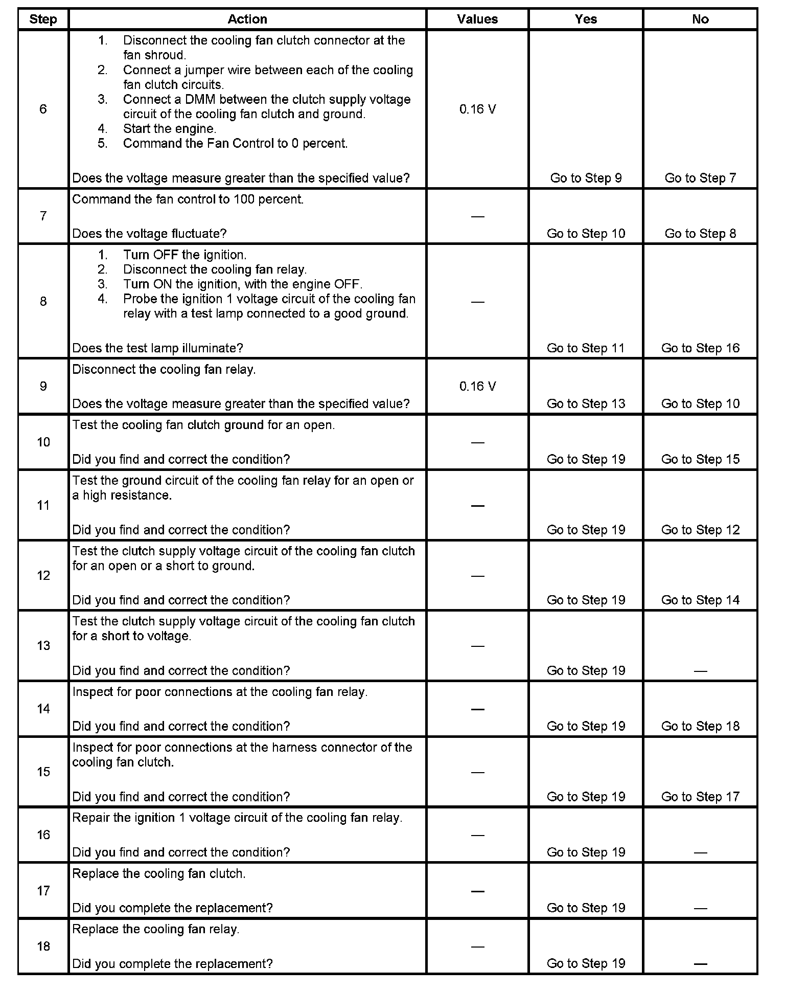 8. This step tests the cooling fan relay for a PWM signal on the cooling fan clutch supply voltage circuit of the cooling fan clutch.