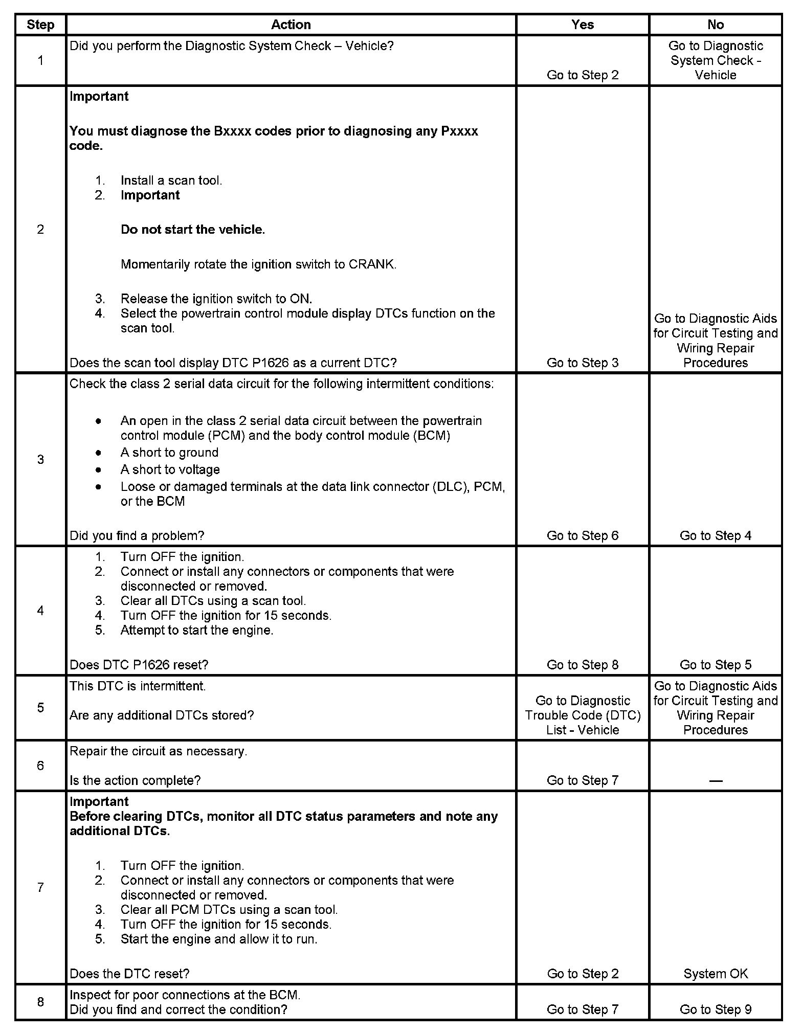 - If the class 2 serial data circuit is shorted to ground or shorted to voltage, then all systems connected to the serial data circuit will not be able to communicate properly. Systems capable of storing loss of communications DTCs, or the DTCs with the letter "U" as a prefix, will have these codes stored in their memory. If a DTC U1192 is stored in the PCM memory along with the P1626, then a fault occurred at some point after the PCM received the correct password. The BCM must also be inspected for intermittent operation due to a loss of power or ground to the module itself. After repairing the cause of DTC 1626, clear all DTCs from the systems capable of storing this DTC and DTC U1192.