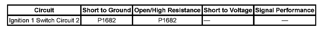 There are 2 ignition 1 voltage circuits supplied to the engine control module (ECM). The first ignition 1 voltage circuit is provided by the powertrain relay, through the TAC fuse, located in the underhood fuse block. This ignition 1 voltage circuit supplies power to all the internal ECM circuits associated with the throttle actuator control (TAC) operation, and to both TAC motor control circuits to the throttle body. The ignition switch provides the second ignition 1 voltage circuit to the ECM, through the ECM 1 fuse located in the underhood fuse block. This ignition 1 voltage provides power to all internal ECM circuits, except those associated with TAC operation. The ECM continuously monitors both ignition 1 voltage circuits. If the ECM detects a voltage level difference between the two circuits, DTC P1682 will set.