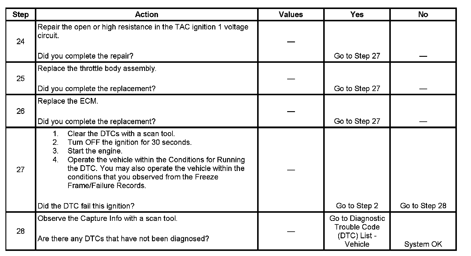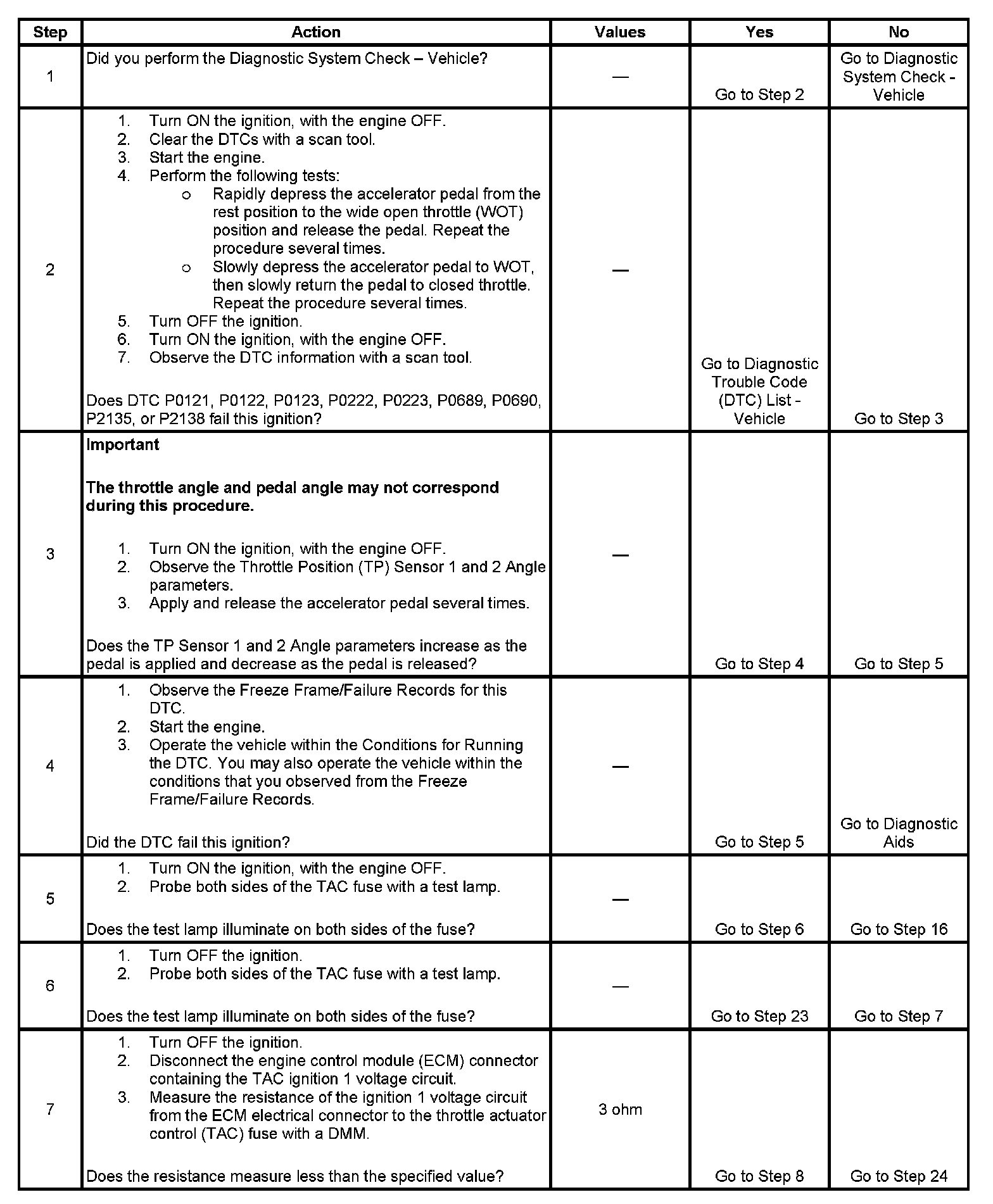 The numbers below refer to the step numbers on the diagnostic table.