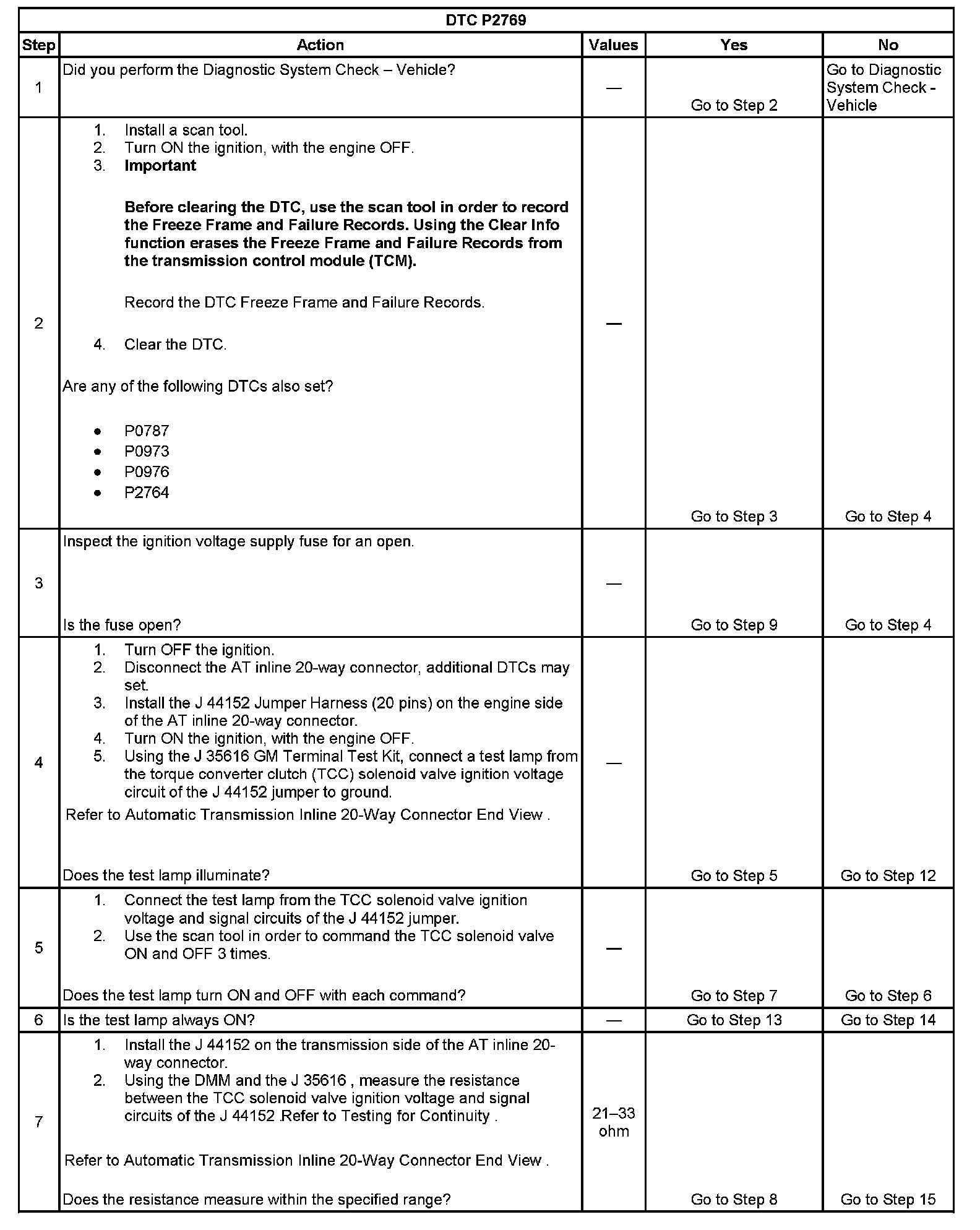 When the TCM detects a continuous open or short to ground in the TCC solenoid valve control circuit, then DTC P2769 sets. DTC P2769 is a type B DTC.