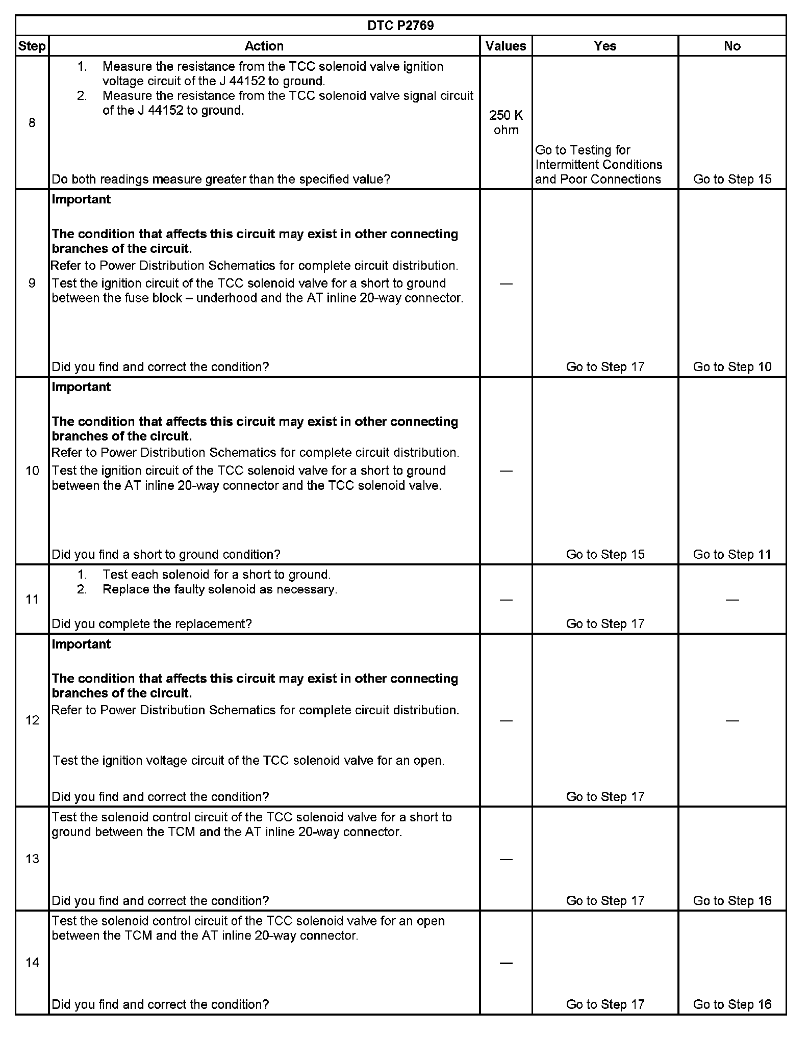 7. This step tests the resistance of the TCC solenoid valve and the automatic transmission (AT) wiring harness.