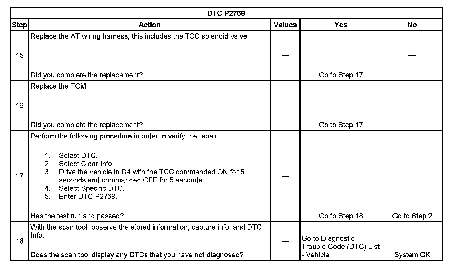 ^ The TCM stores DTC P2769 in TCM history during the second consecutive trip in which the Conditions for Setting the DTC are met.