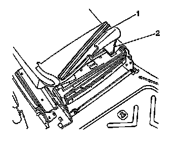 9. Remove the two rear seat back mounting bolts (1) securing the inner riser assembly to the seat back frame.