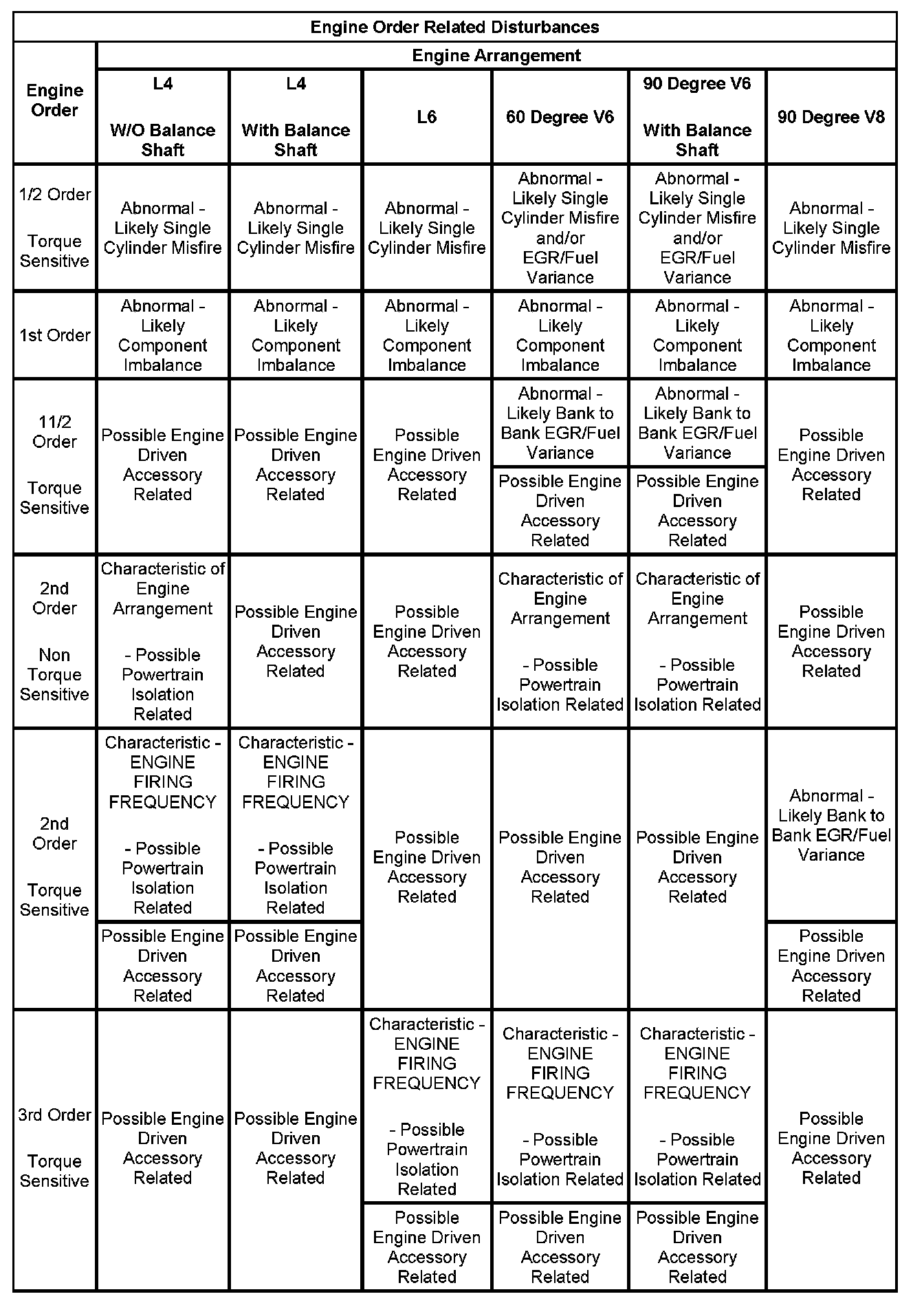 3. If the dominant frequency in Hz, recorded during duplication of the disturbance and the engine firing frequency in Hz, just calculated ARE related, then an engine FIRING FREQUENCY related disturbance is present. Engine firing frequency disturbances are usually related to improper isolation of a component. Refer to the Engine Order Related Disturbances table.