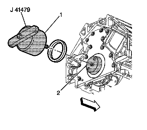 3. Install the J 41479 cone (2) and bolts onto the rear of the crankshaft.