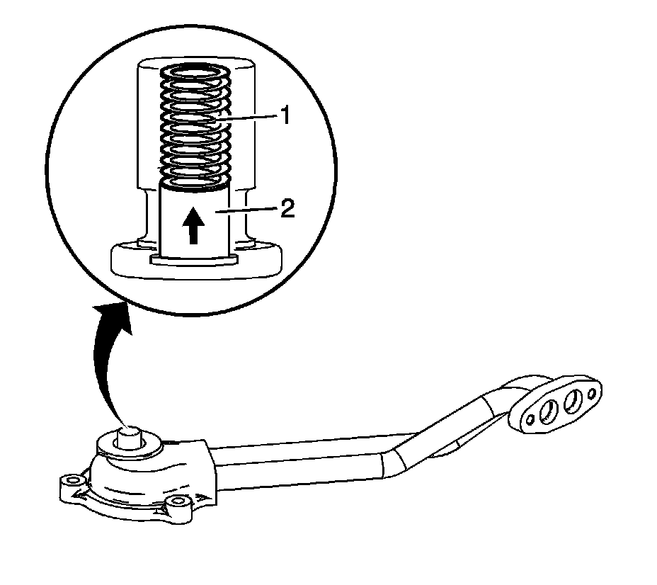 10. Inspect the displacement on demand oil pressure relief valve for proper operation.Lightly depress the valve (2). The valve spring (1) should seat the valve to the proper closed position.