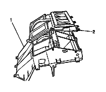 4. Remove screws in order to separate the defroster/mode outlet cover (2) from the HVAC module assembly (1).