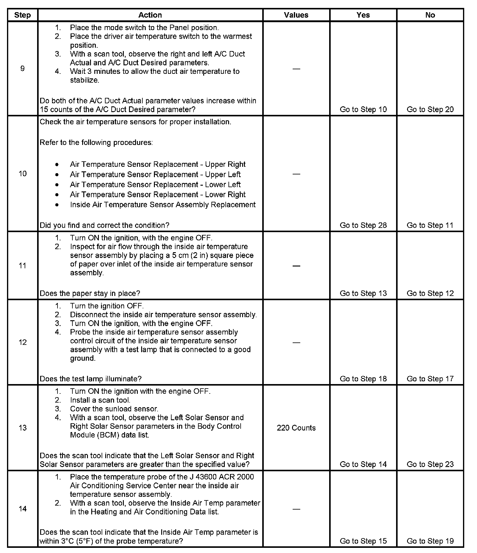 9. This step ensures that the upper air temperature sensors operate properly. The LH and RH AC Duct Actual parameter count values should lower as the air temperature of the ducts get warmer. If there is a high resistance in either of the air temperature sensors circuits or the sensor itself then the count value of the effected sensor would remain high.