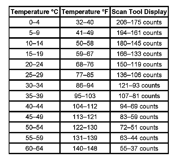 15. Use the table to determine that the recorded scan tool values are within range for the recorded probe temperatures of the J 43600 ACR 2000 Air Conditioning Service Center.