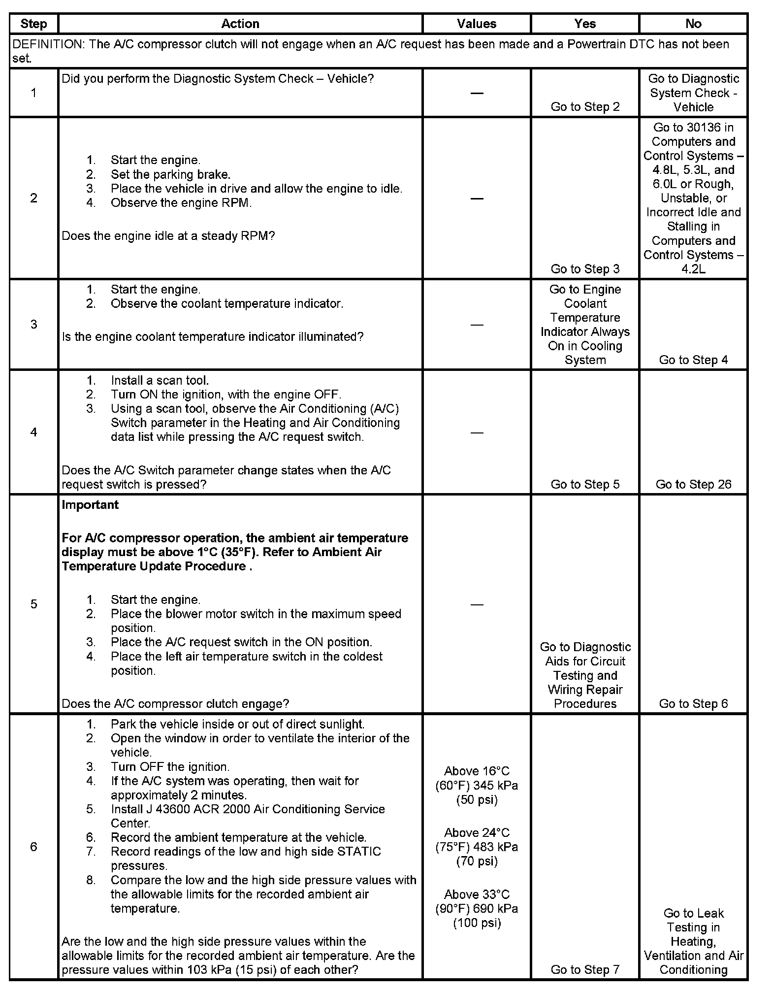 6. This test ensures that there is sufficient refrigerant in the A/C system. The specific values come from the A/C System Performance Test in Heating, Ventilation and Air Conditioning.