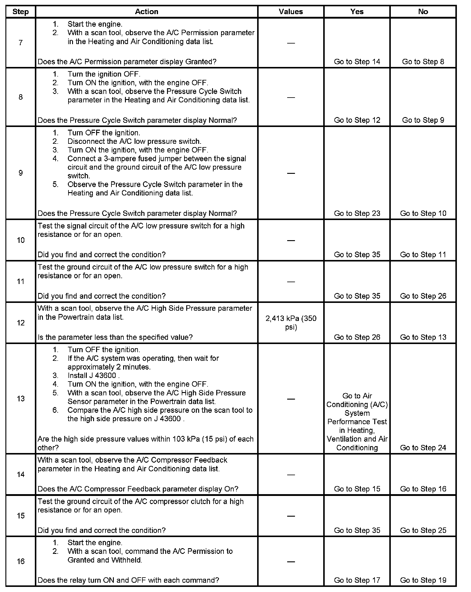 12. The A/C compressor relay output from the powertrain control module (PCM) is disabled if the A/C high side system pressure is interpreted to be higher than 2413 kPa (350 psi).