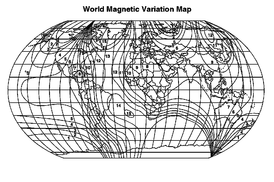 1. Locate your current geographic location on the World Magnetic Variation Map.