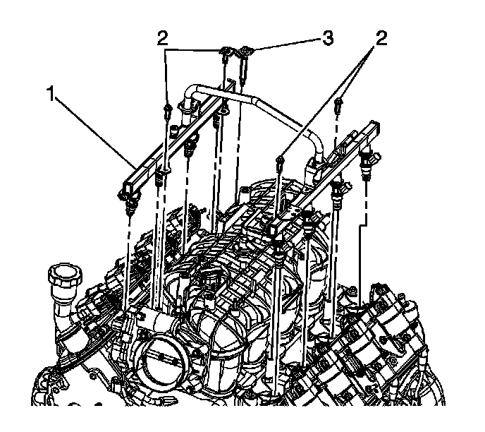 17. Remove the fuel rail bolts (2 and 3).