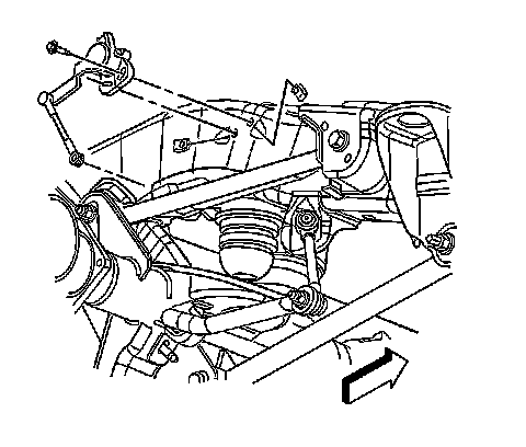Notice: Failure to remove the air suspension auto level control sensor locating pin before the rear axle support is removed will cause damage to the air suspension auto level control sensor.