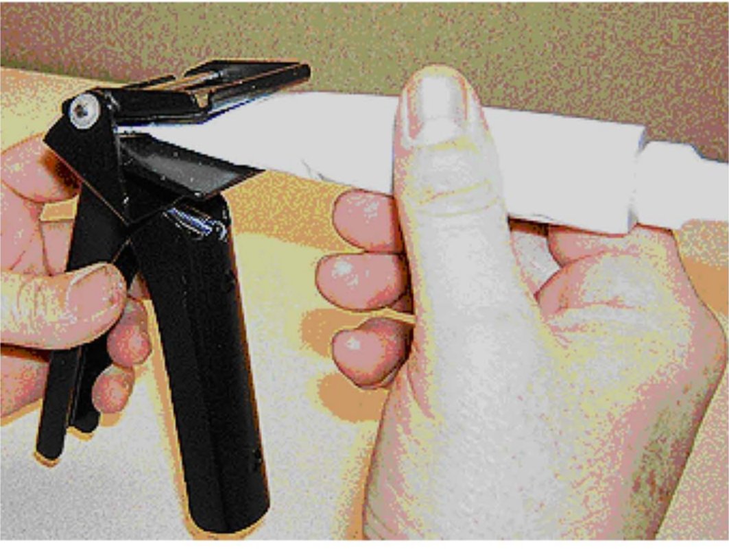 1. To use the sealant dispenser correctly install the two white tabs on the rear handle (1) over the front handle. The white paint marks are for demonstration purposes only. Now your dispenser is ready to install engine sealant 0.075 kg (75 gram) squeeze tube.