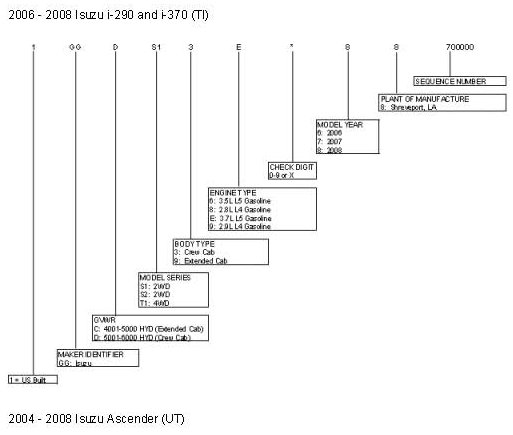 This bulletin provides a complete breakdown of the Isuzu Vehicle Identification Number for 2008 i-290/ i-370 and 2008 Ascender vehicles.