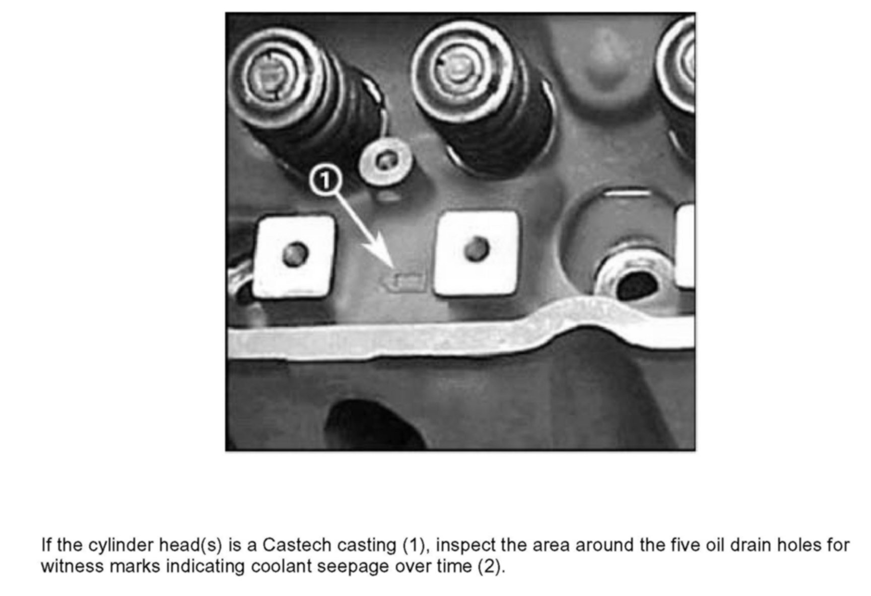 If the cylinder head(s) is a Castech casting (1), inspect the area around the five oil drain holes for witness marks indicating coolant seepage over time (2).