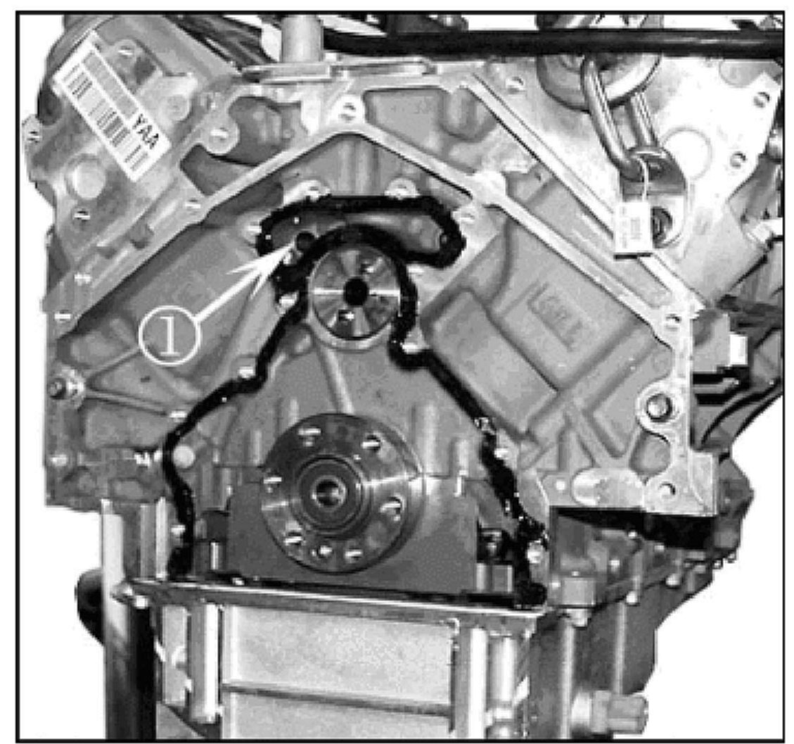 Follow the steps for Oil Leak Diagnosis in the Service Manual to determine the source of the leak. If the leak has been diagnosed as coming from the rear cover assembly, remove the rear cover assembly and inspect for engine block porosity where the rear cover mates to the engine block. If porosity is found anywhere on the sealing surface, use the following procedure to apply RTV to repair the engine block porosity (refer to illustration shown).