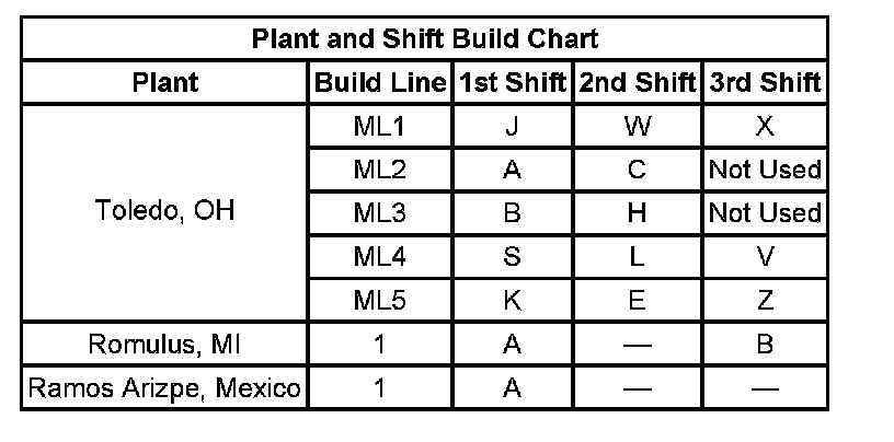 12 - Build Location Y = Toledo, OH, R = Romulus, MI, 4 = Ramos Arizpe, Mexico