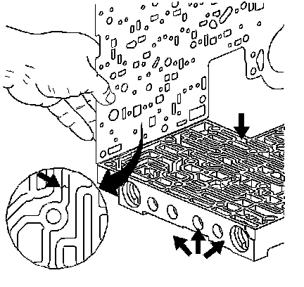 1. Inspect the valve body to spacer plate gasket for valve body channel witness marks. The witness marks should be complete. Incomplete witness marks may be caused by an uneven case surface. Incomplete witness marks may also be caused by cross-channel leaks.