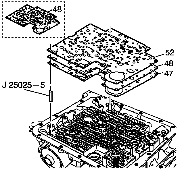 Place the spacer plate to case gasket (47) (identified by a "C") and the spacer plate to valve body gasket (52) (identified by a "V") on the spacer plate (48). Retain gaskets on the spacer plate with J 36850 or equivalent.