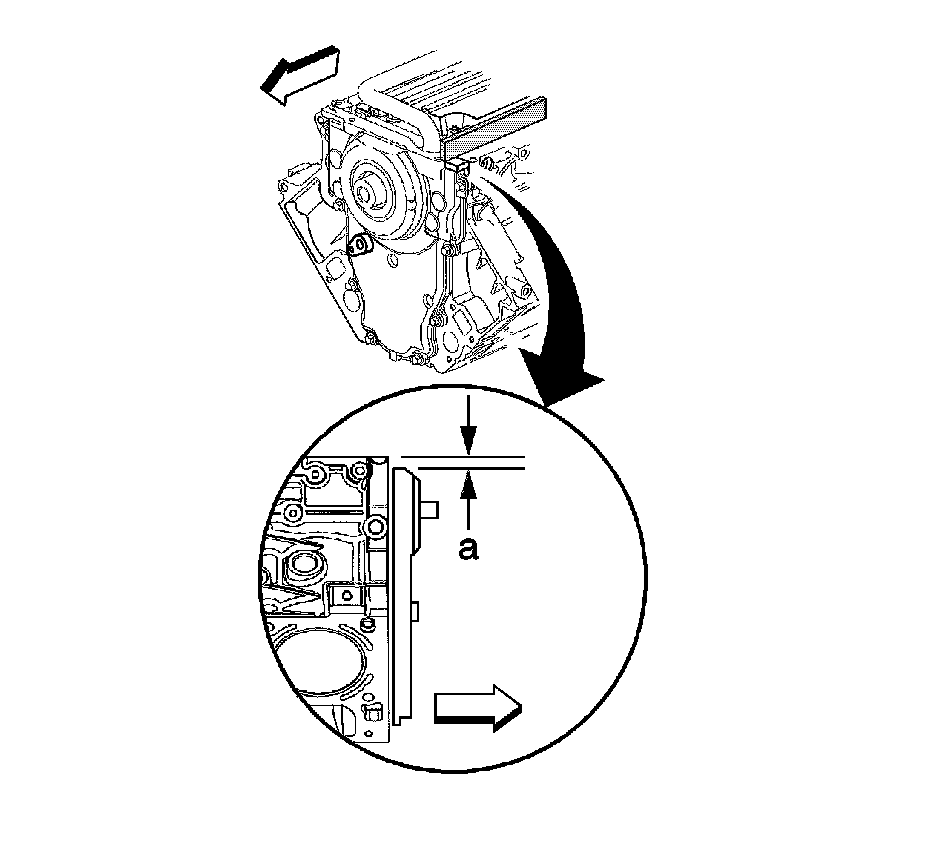 1. Insert a feeler gage between the front cover and the straight edge tool. The cover must be flush with the oil pan surface, or no greater than 0.5 mm (0.02 inch) (a) below flush.