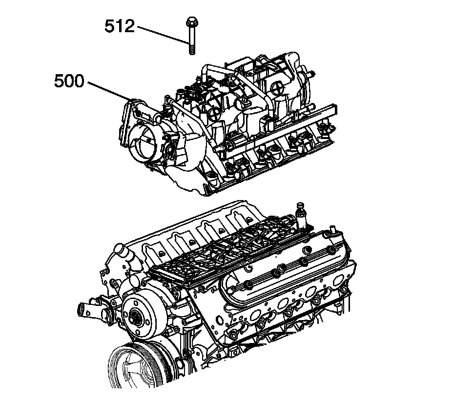 3. Apply a 5 mm (0.20 inch) band of threadlock GM P/N 12345382 (Canadian P/N 10953489) to the threads of the intake manifold bolts (512). Refer to Sealers, Adhesives, and Lubricants.