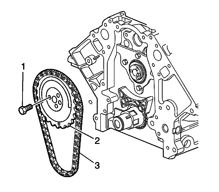 6. Install the camshaft sprocket (2) and timing chain (3).