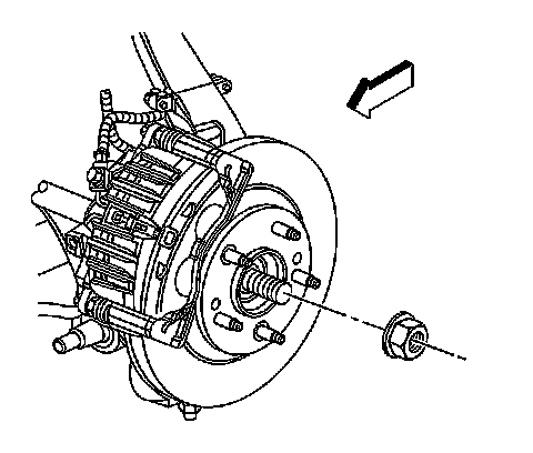 6. Disengage the wheel drive shaft from the wheel hub and bearing. Place a brass drift against the outer end of the wheel drive shaft in order to protect the wheel drive shaft threads. Sharply strike the brass drift with the hammer. Do not attempt to remove the wheel drive shaft from the wheel hub and bearing at this time.