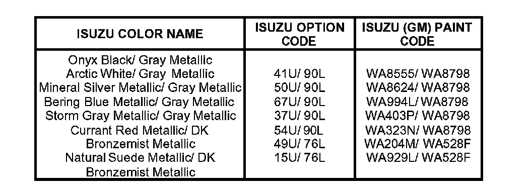 1. Isuzu Motors America, Inc. does not endorse any paint company or type of paint; this information is for reference only.