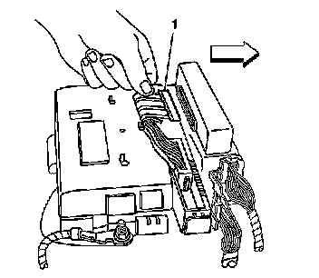6. Engage the sliding latch fastening the BCM to the rear electrical center. Slide the latch outboard until the locking tab (1) is fully seated.